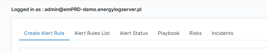 The Energylogserver SIEM Alerting interface consists of 4 main tabs within the SIEM section: