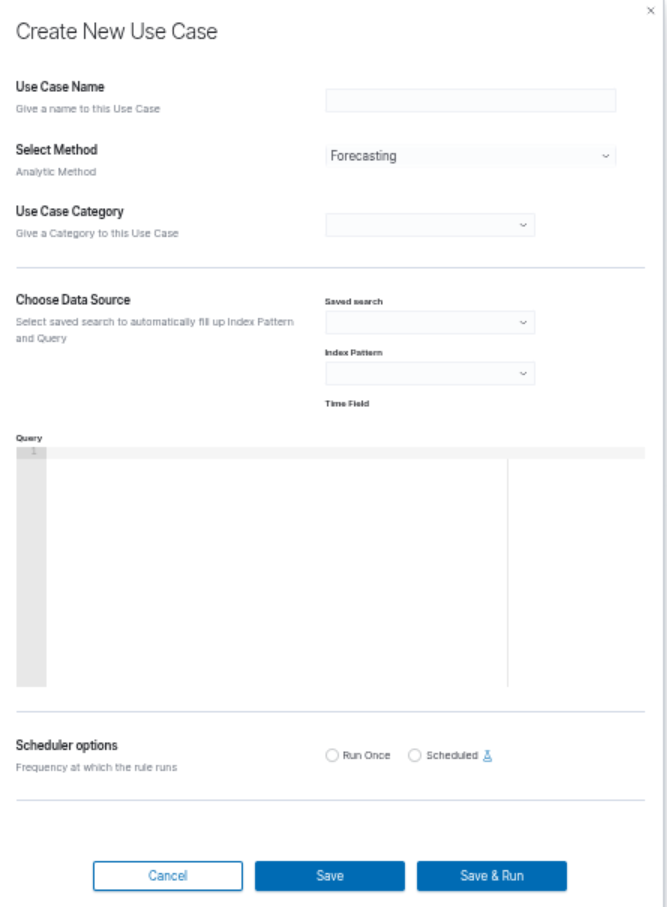 In the Create New Use Case dialog, select the saved search from the Saved search dropdown. The Index Pattern and Query fields will be filled in automatically. Alternatively, select the index pattern and enter the query manually.