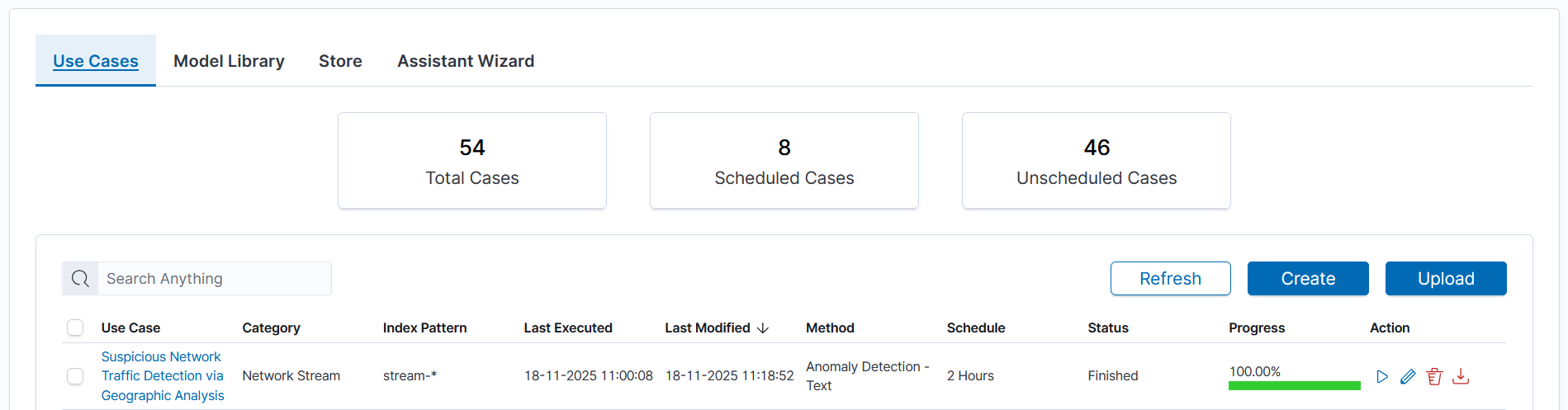 Use Case- unique name for the rule running on selected dataCategory- given category name upon createIndex Pattern- data to work withLast Executed- date when last use case was ExecutedLast Modified- when last use case configuration was changedMethod- selected algorithmSchedule- configuration of scheduling optionsStatus- current calculation statusProfress- progress bar in %Action- additional use case management