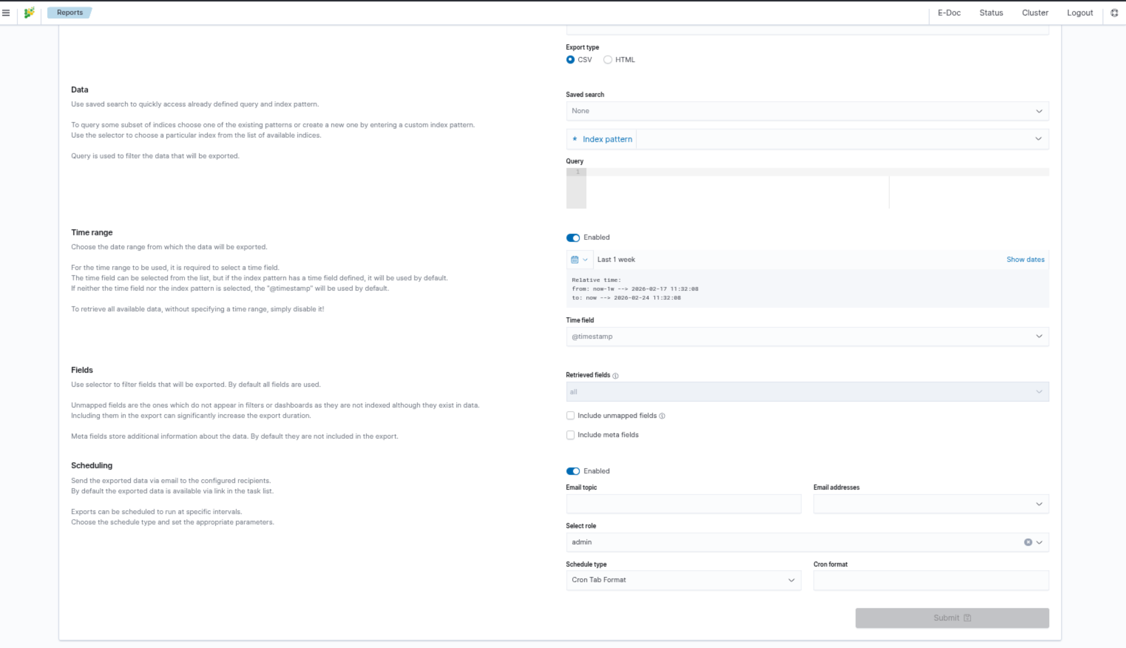 Select the data source for the export. You can use a saved search to quickly access a predefined query and index pattern, or select an index pattern directly from the Index pattern dropdown. Use the Query field to filter the data that will be exported.